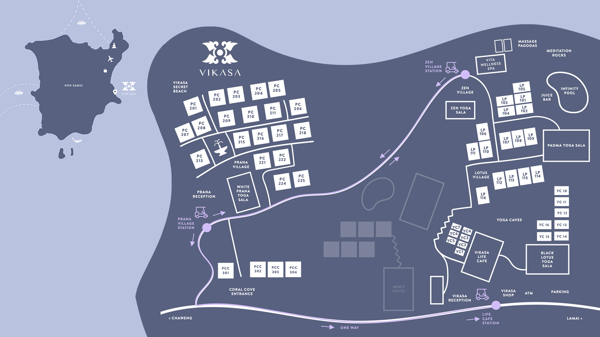 - Plan du resort Vikasa (PDF) — Pour repérer rapidement les villages, les salles de pratique (shala) et les points clés du site avant votre arrivée. Téléchargez le plan ici.